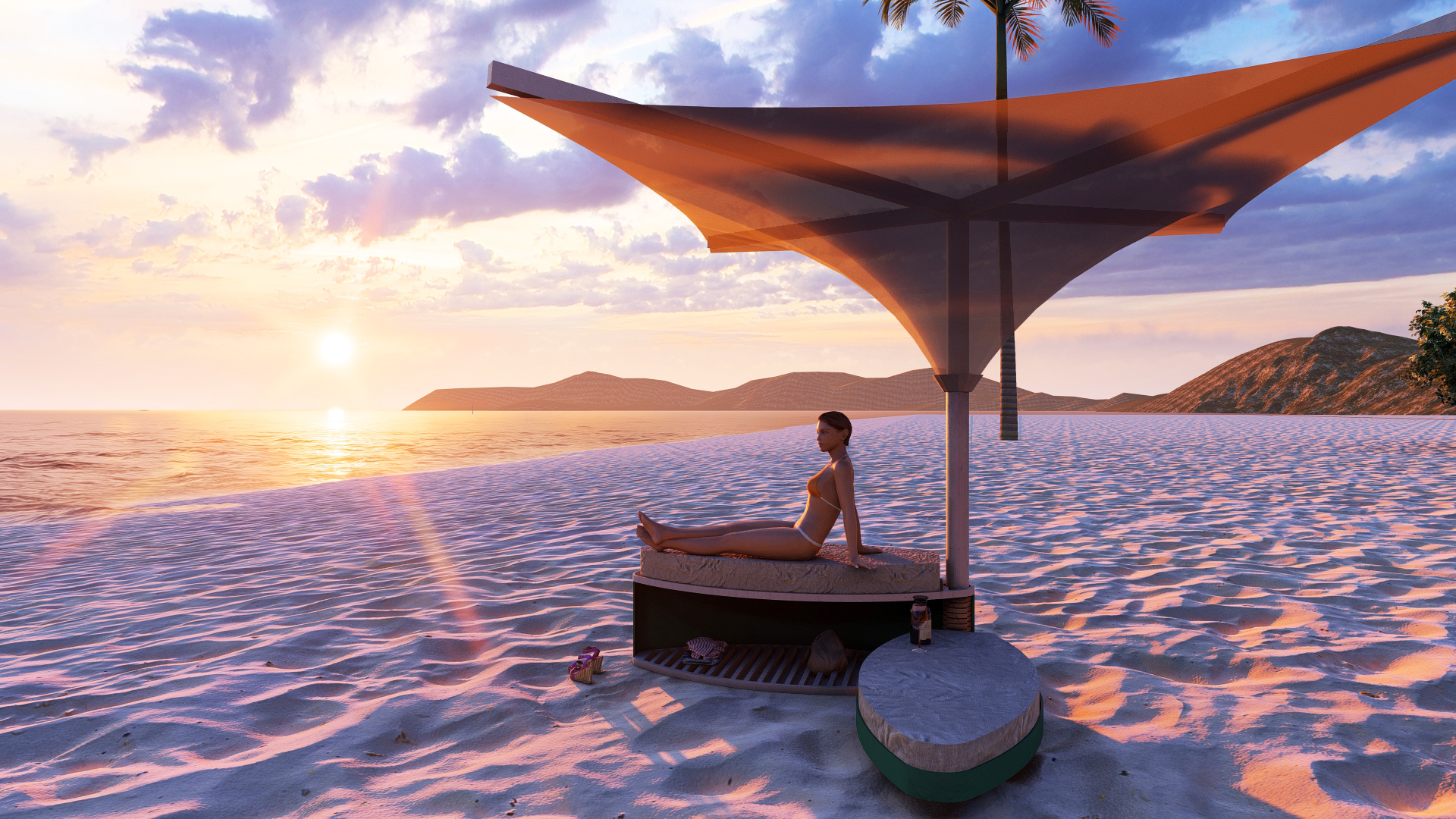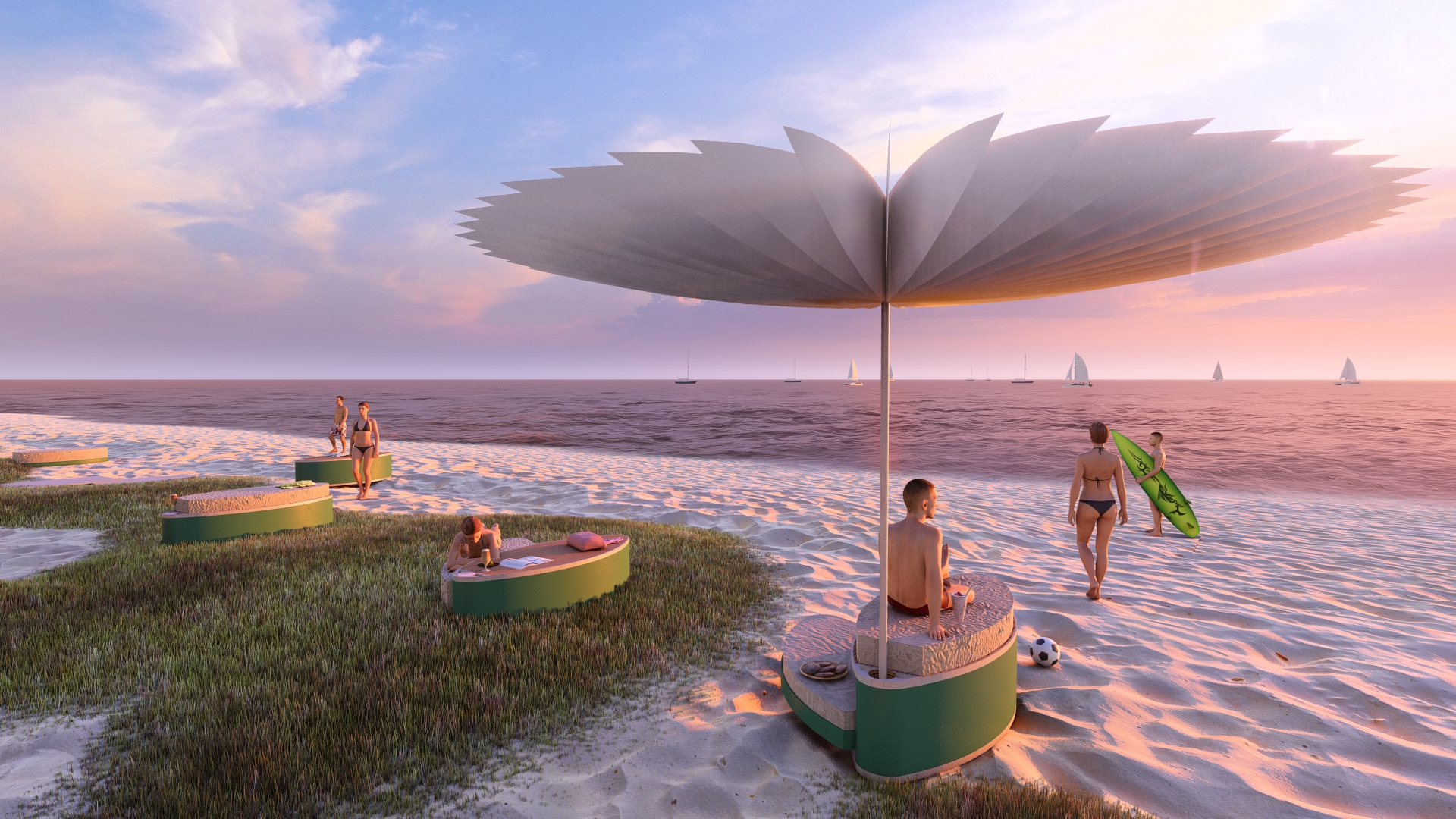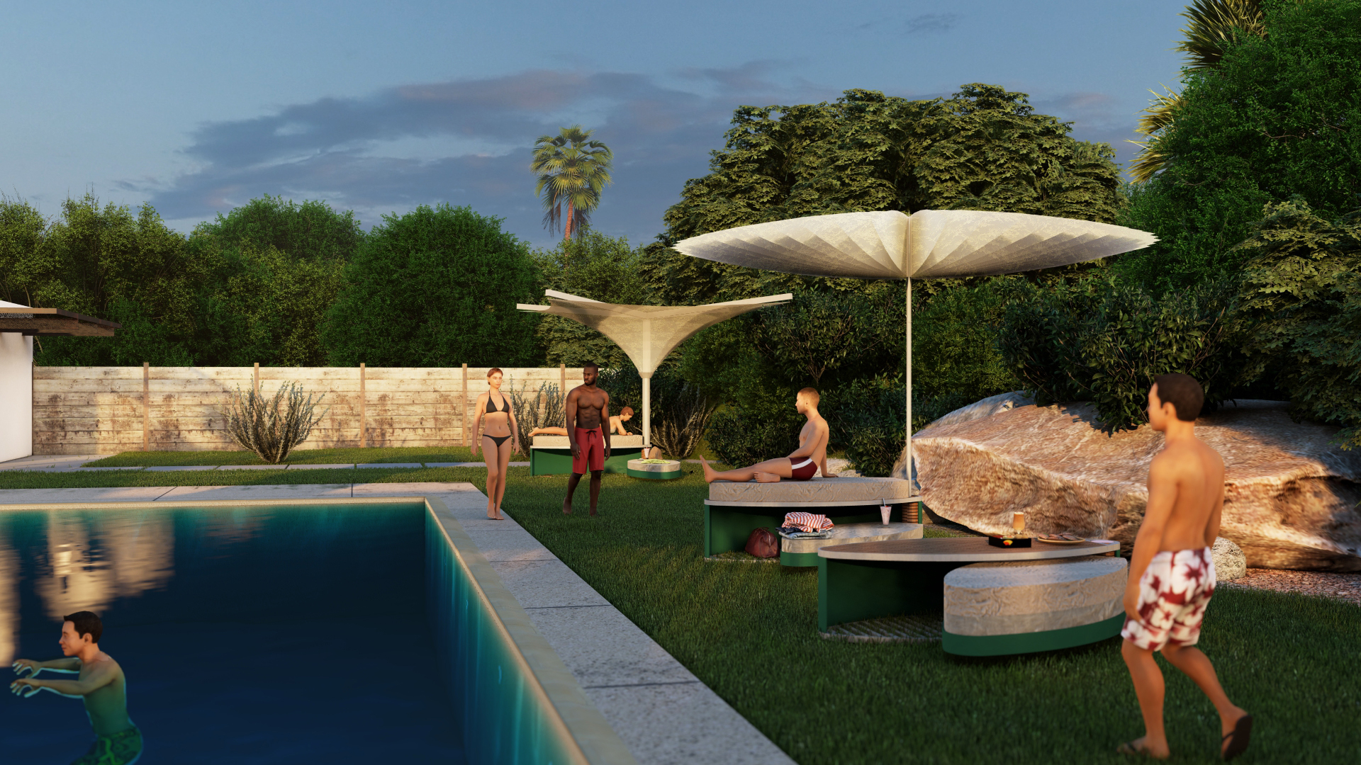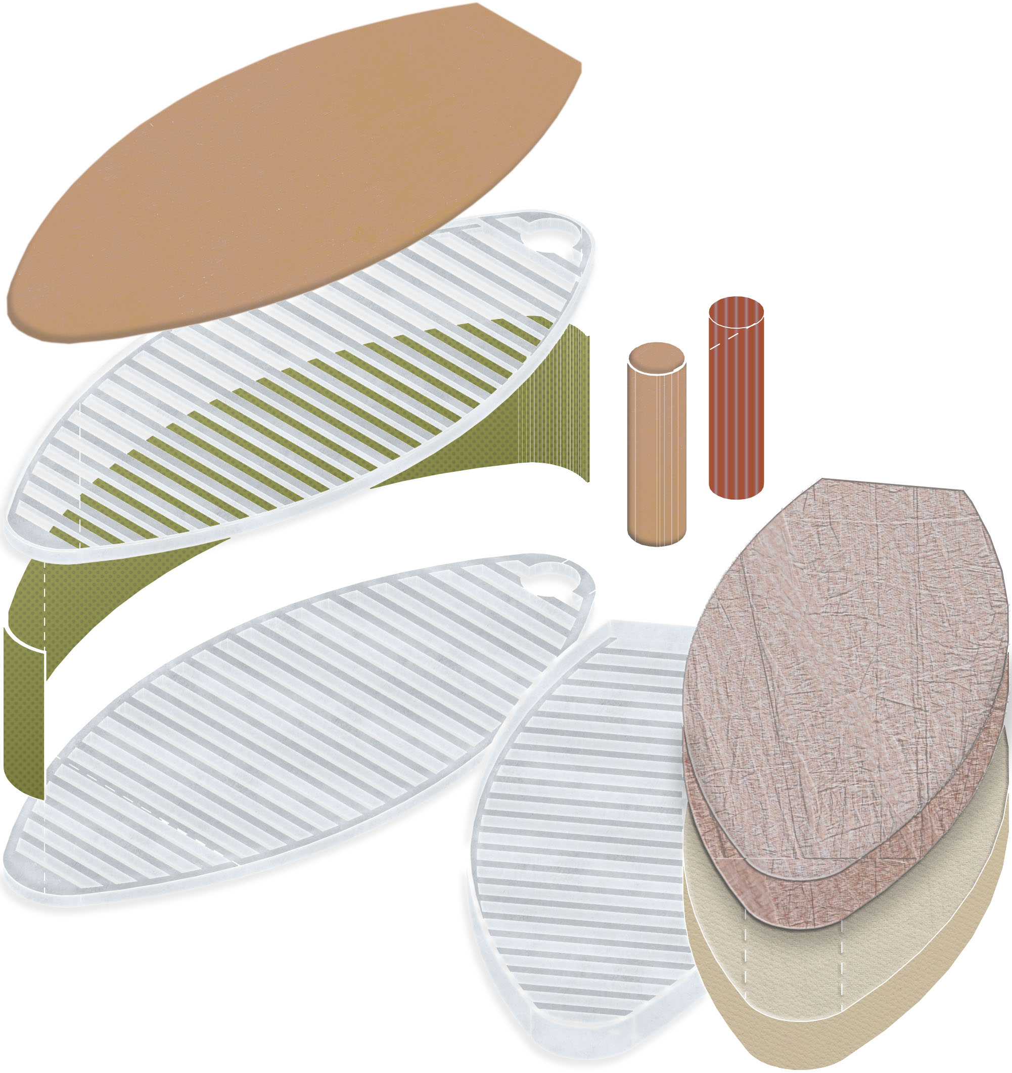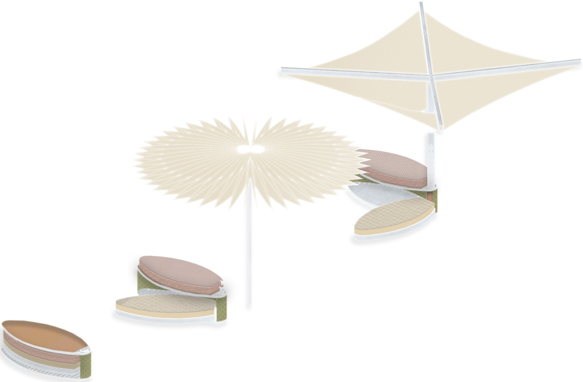 L’idea trae spunto dalle pale del FICO D’INDIA. Questi ovali allungati spesso sono accoppiati. La struttura potrà essere: una panchina, un lettino, un lettino matrimoniale, un tavolo di appoggio, un contenitore. In tutte queste configurazioni si sarà in grado di poter aggiungere un elemento ombreggiante, fisso o mobile. Il “PAL_E” sarà costituito da due telai a fasce a forma di pala di fico d’india, uno inferiore che poggerà la struttura a terra e uno superiore della stessa forma collegati tra loro mediante una lamiera di alluminio, che andrà a chiudere metà dell’elemento. Un altro punto di connessione è il cilindro metallico che fungerà non solo da perno di rotazione della terza piastra a forma di pala, leggermente più piccola che potrà aprirsi e chiudersi per far uscire il secondo lettino